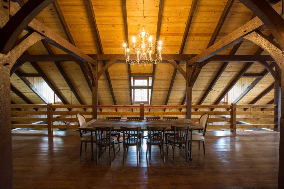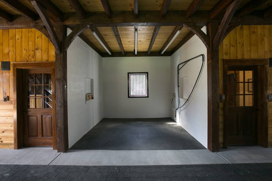 This barn includes nearly 2,400 square feet of room, with horses on the first floor and a recreation area above. We created a unique interior with Douglas fir timber frames, and a distinctive exterior with B&B cedar siding on the base and Skirl wavy cedar siding on the gables. A standing seam roof completes this beautiful family barn.