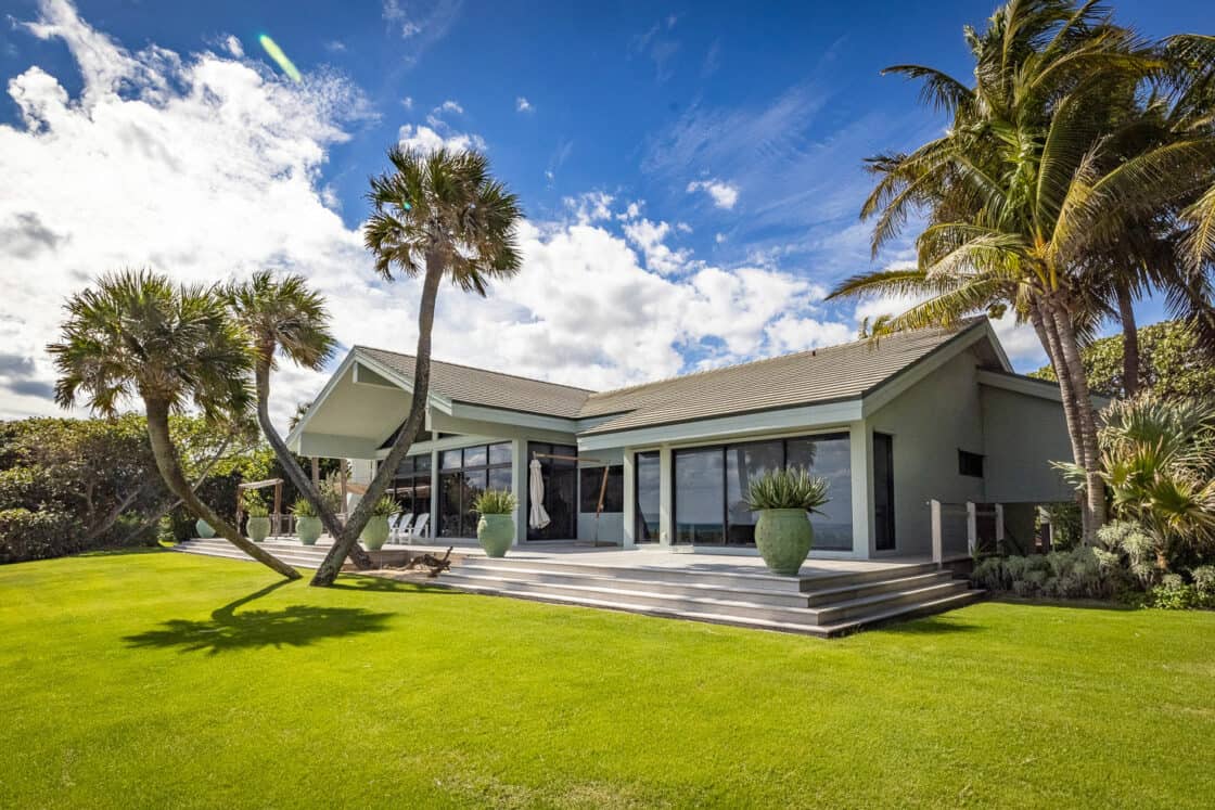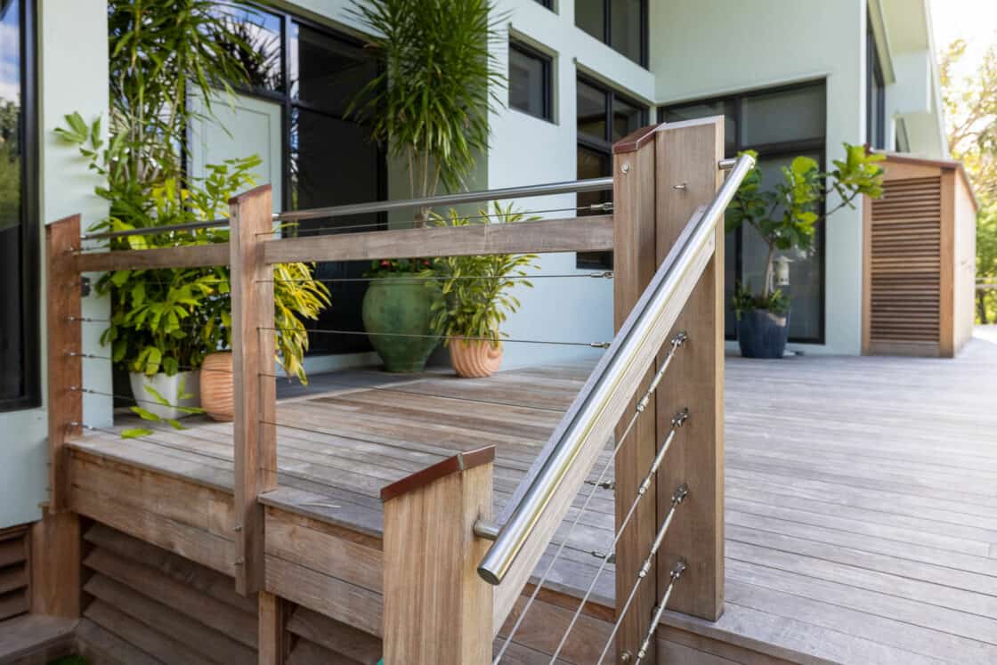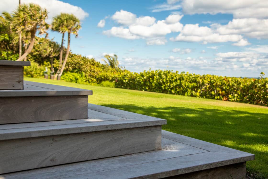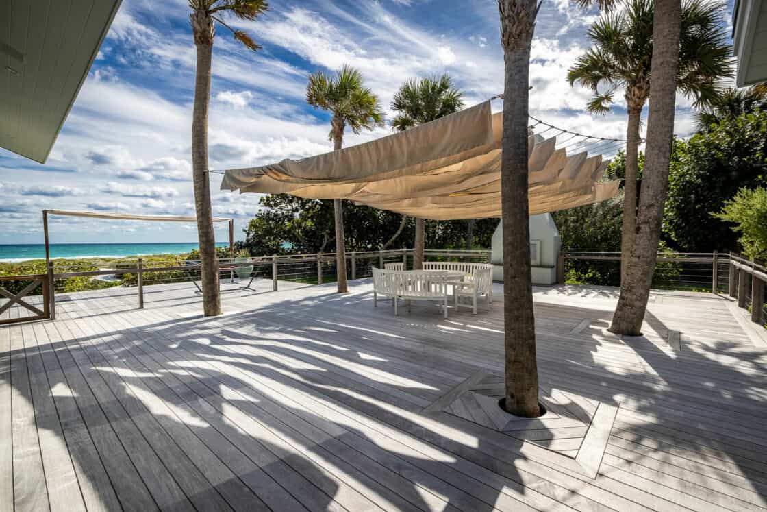 This deck was originally built with substandard decking material and needed an upgrade. B&D rebuilt it with Brazilian ipe wood, a very dense and durable hardwood ideal for outdoor use. The owners also wanted to add shade. A pergola was not allowed, so a cable was strung between the palm trees in the middle of the deck, and a fabric was hung to create shade underneath. It can be removed easily in the event of a hurricane or if the owners want to change up the look with a new fabric. A doggie yard was also added to complete this beach oasis.