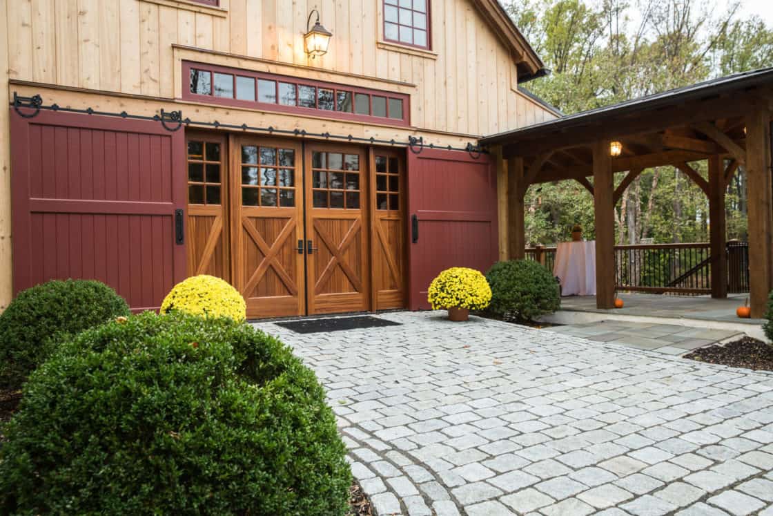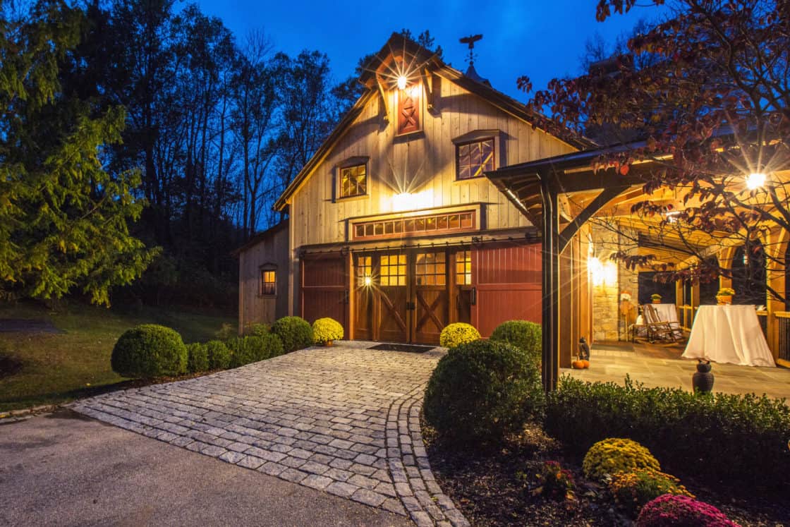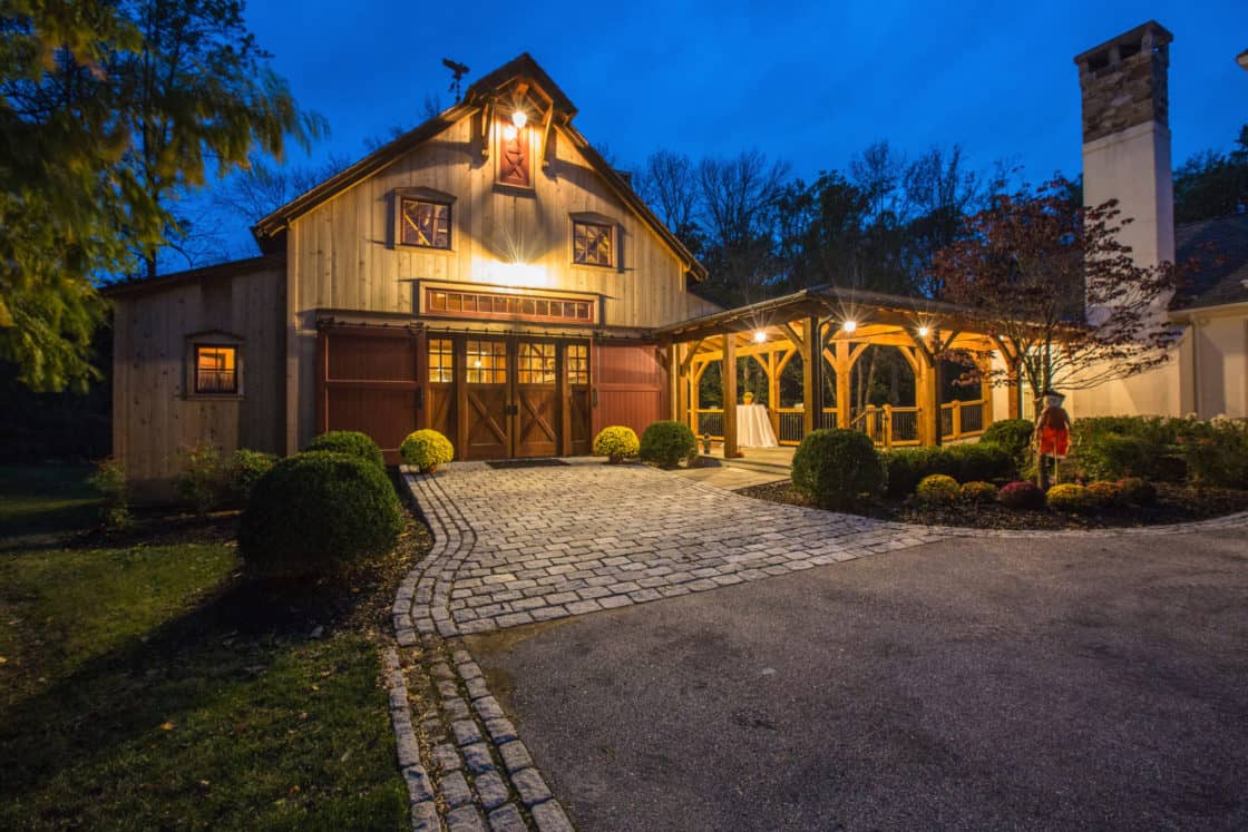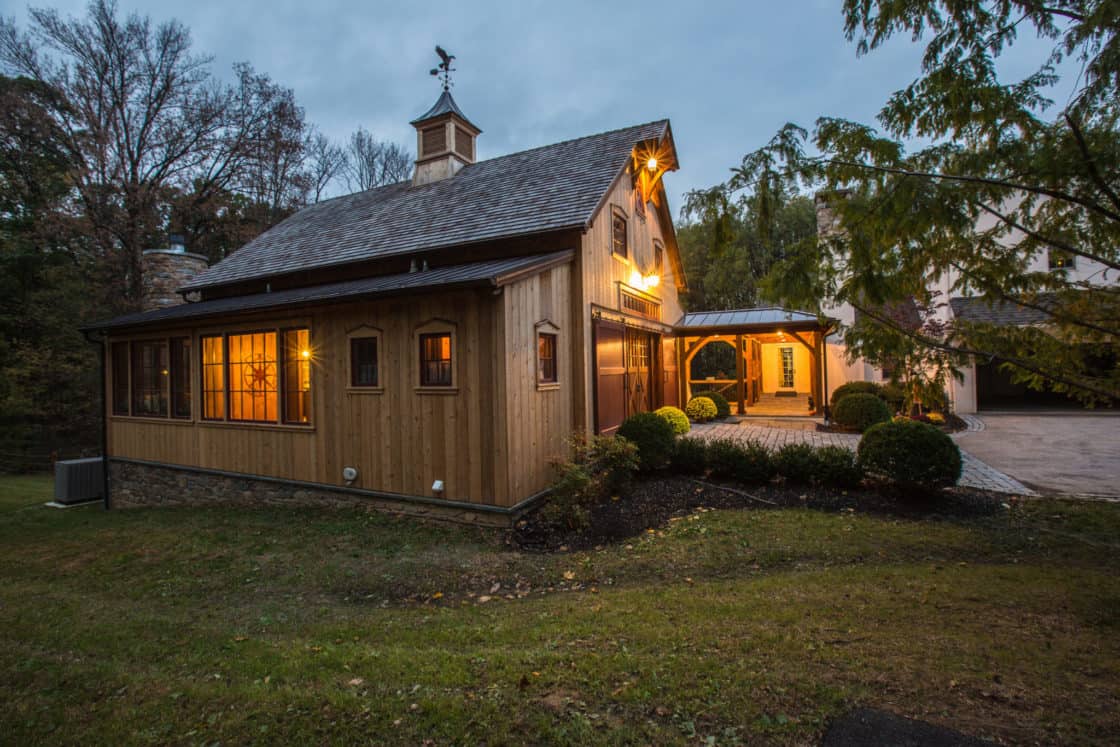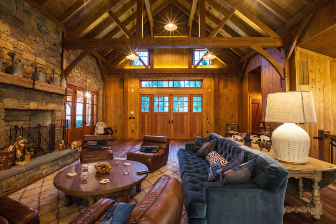 This beautiful custom party barn provides a comfortable space for entertaining friends and family. Stained Douglas fir timber framing, cedar siding, natural stone, cedar shake roofing, and hammered wrought iron create a rustic look for the 3,200 square foot home. It includes two bedrooms with full baths, a kitchen with a pizza oven, and indoor and outdoor seating areas. A covered breezeway attached to the main home makes the party barn feel like part of the same structure while ensuring privacy for both the family and their guests.