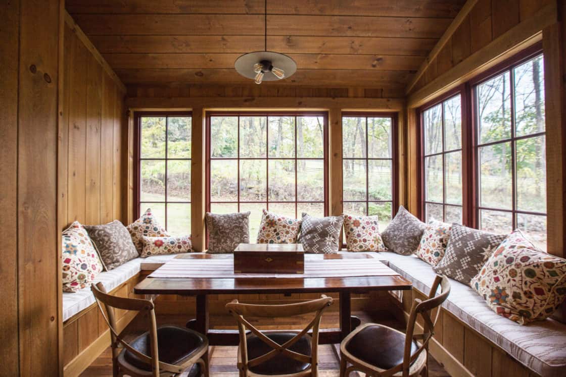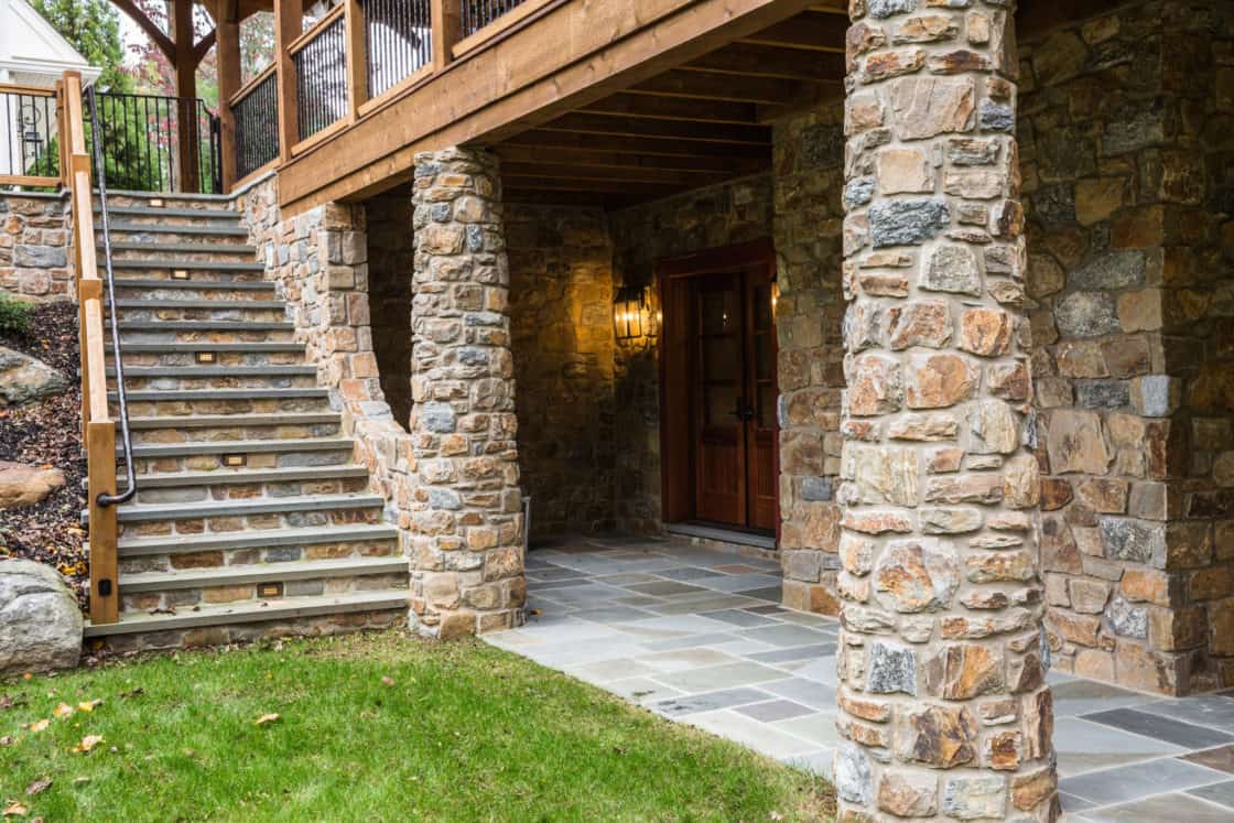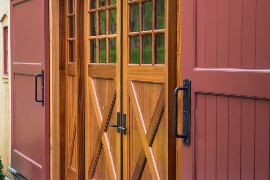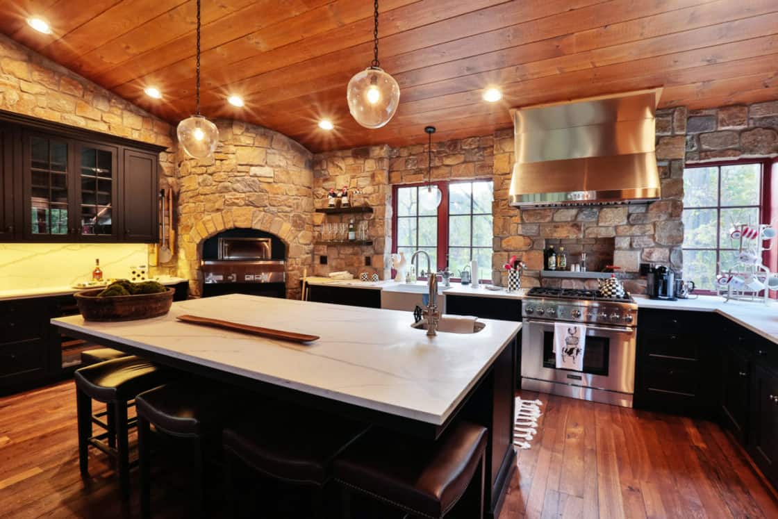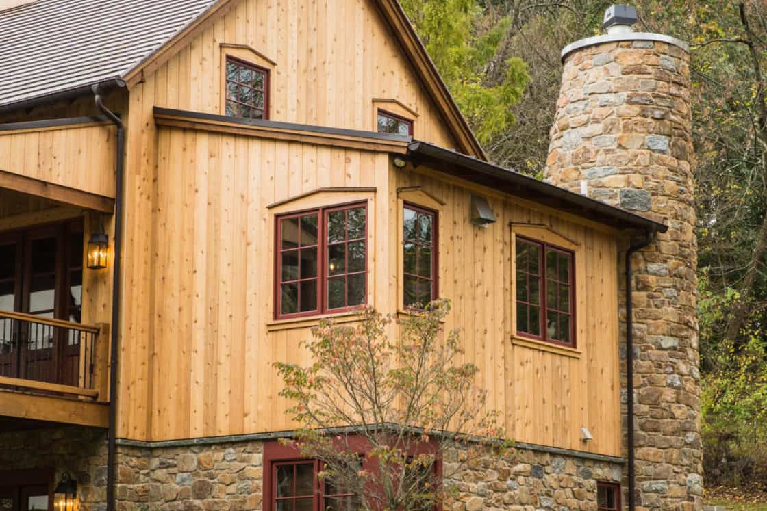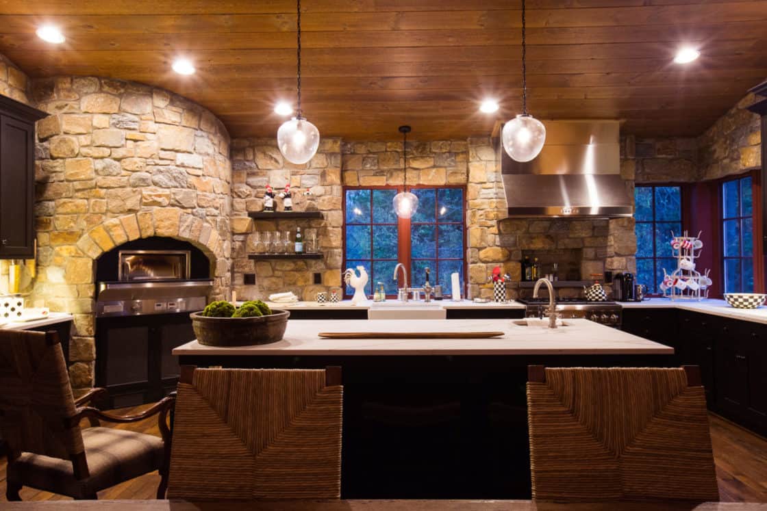 This beautiful custom party barn provides a comfortable space for entertaining friends and family. Stained Douglas fir timber framing, cedar siding, natural stone, cedar shake roofing, and hammered wrought iron create a rustic look for the 3,200 square foot home. It includes two bedrooms with full baths, a kitchen with a pizza oven, and indoor and outdoor seating areas. A covered breezeway attached to the main home makes the party barn feel like part of the same structure while ensuring privacy for both the family and their guests.