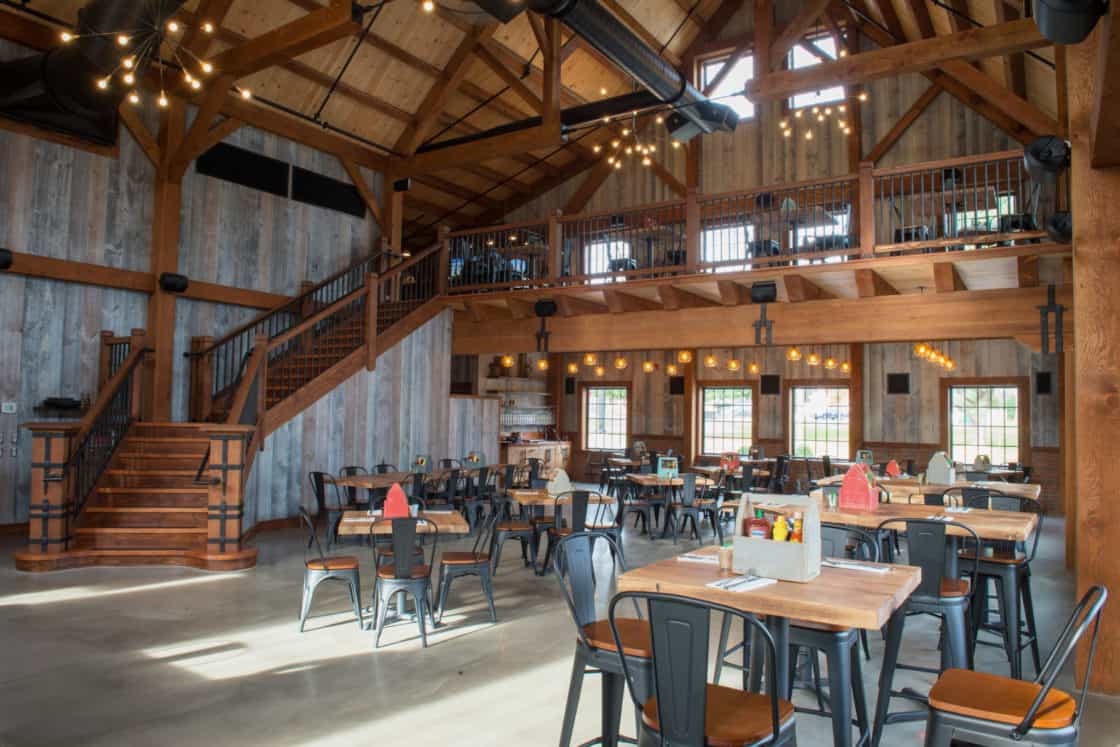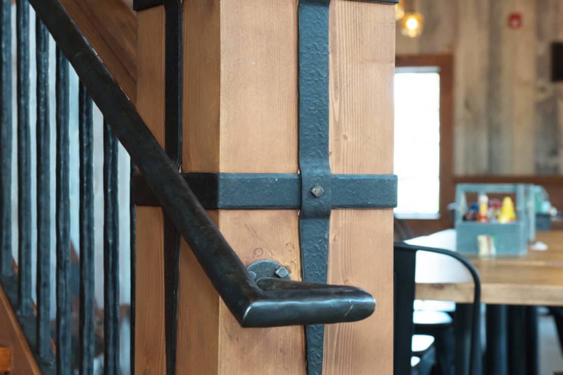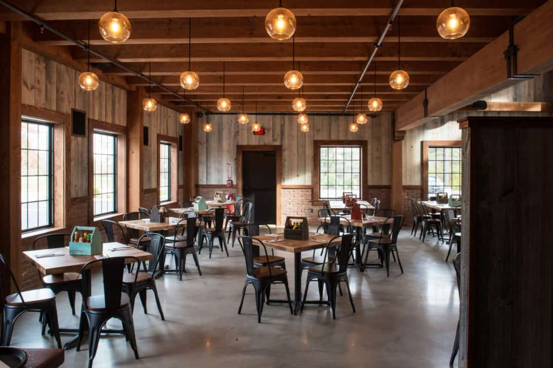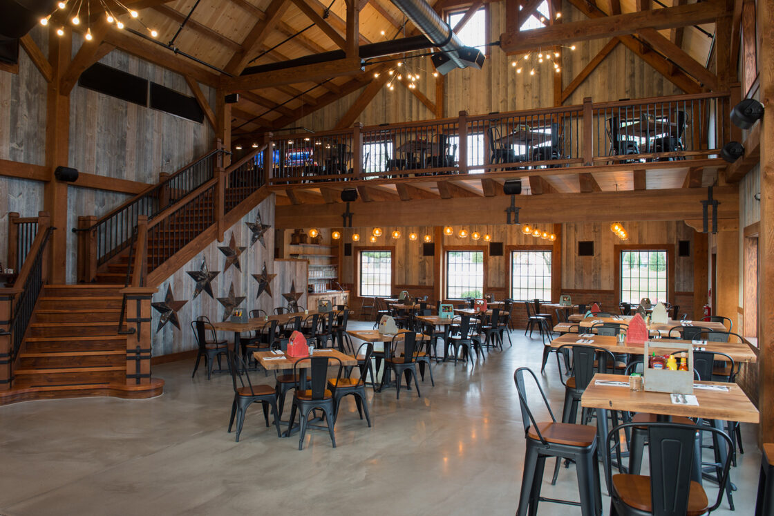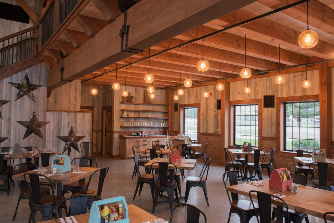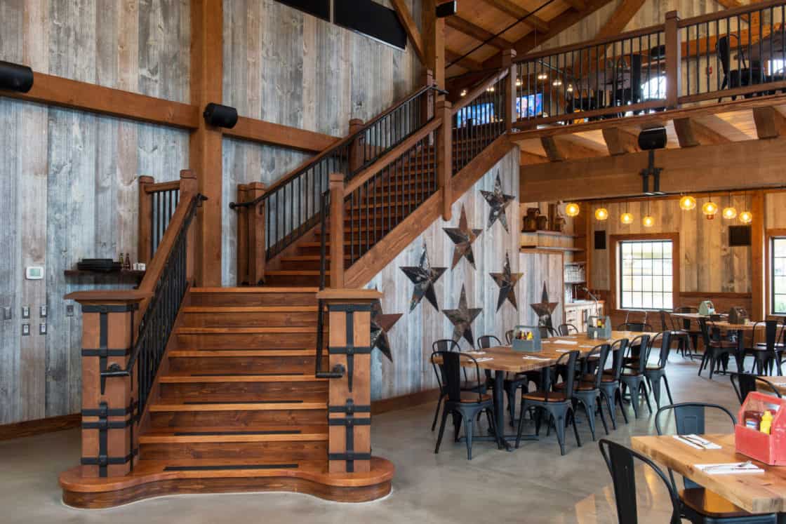 This custom-crafted burger restaurant deserved a custom-crafted home. A blend of traditional timber building with modern touches, the 3,800-square-foot space is filled with bold timber framing to complement the bold beers and flavors on the menu. Hand-forged metal hardware is featured throughout, and a beautiful bar paneled with reclaimed hewn oak dazzles in the center of the room. A grand staircase leads to a second-story loft, letting diners take in the bustling scene below.