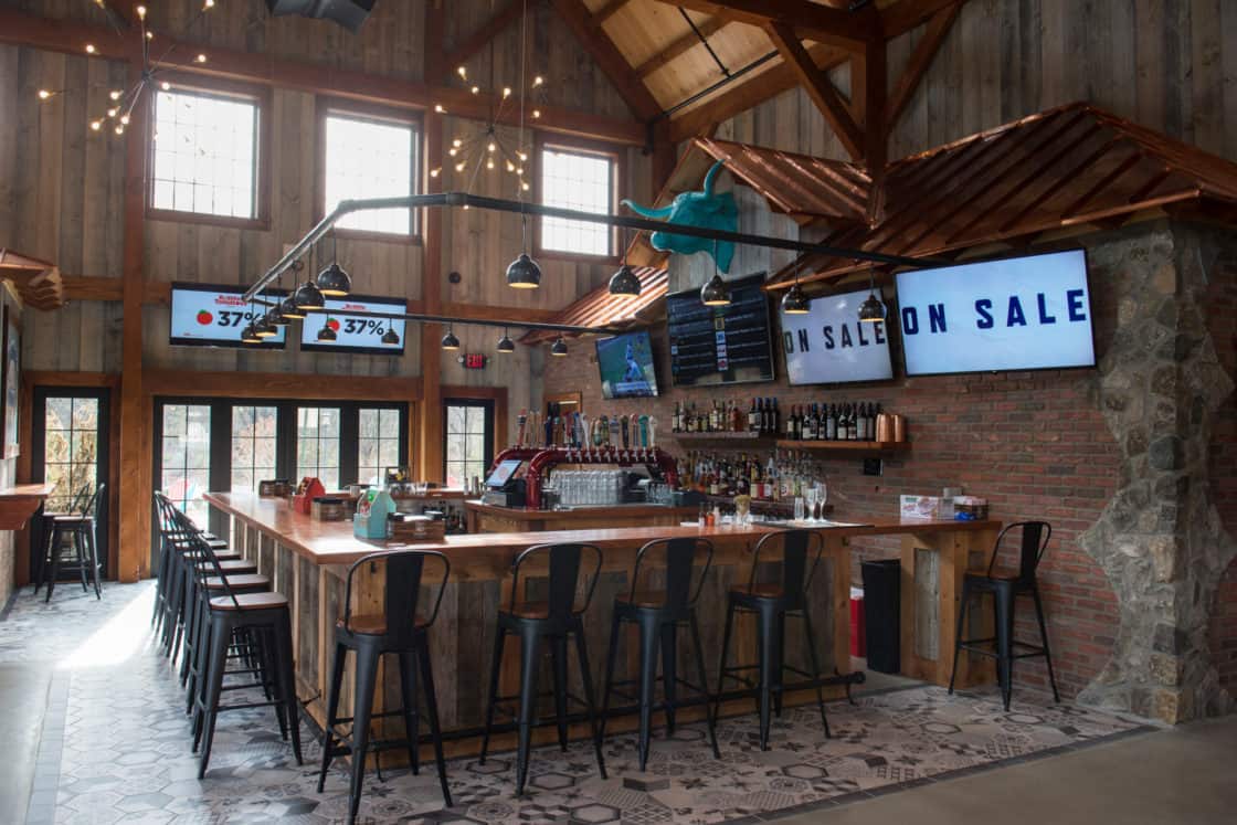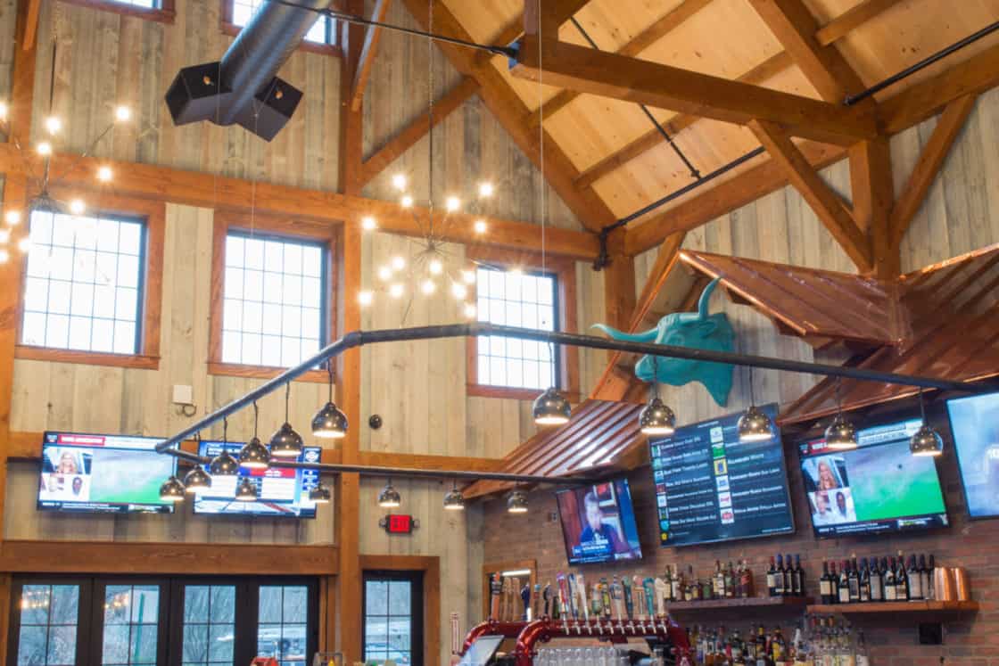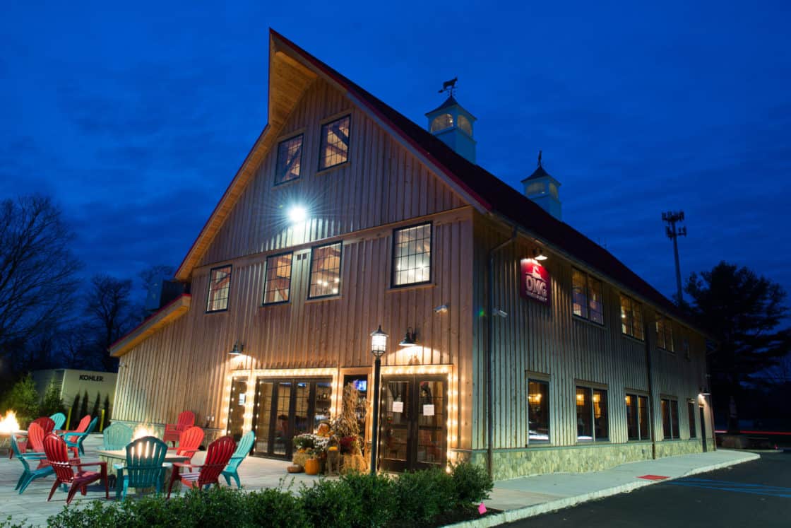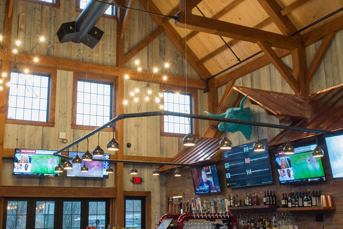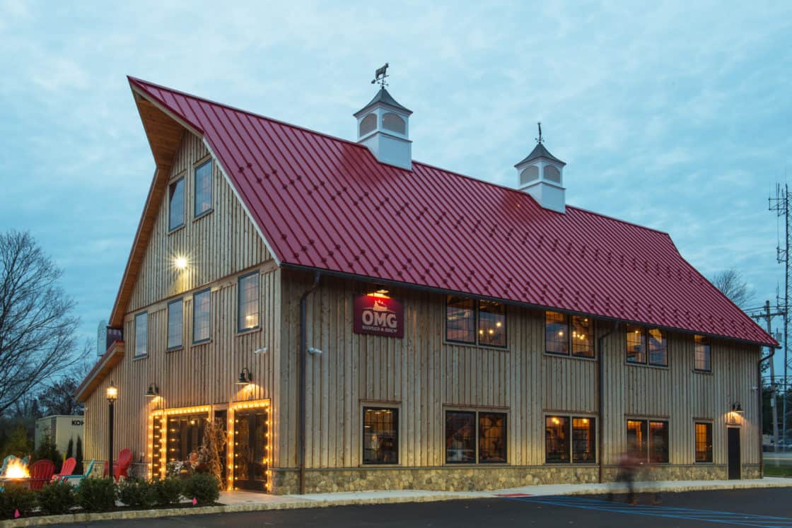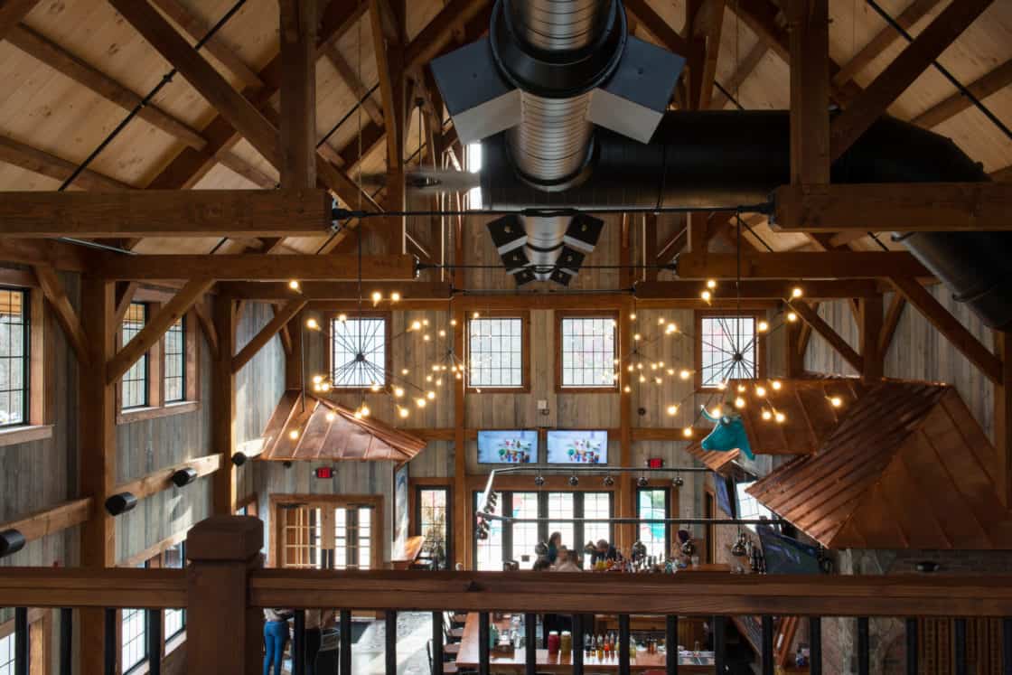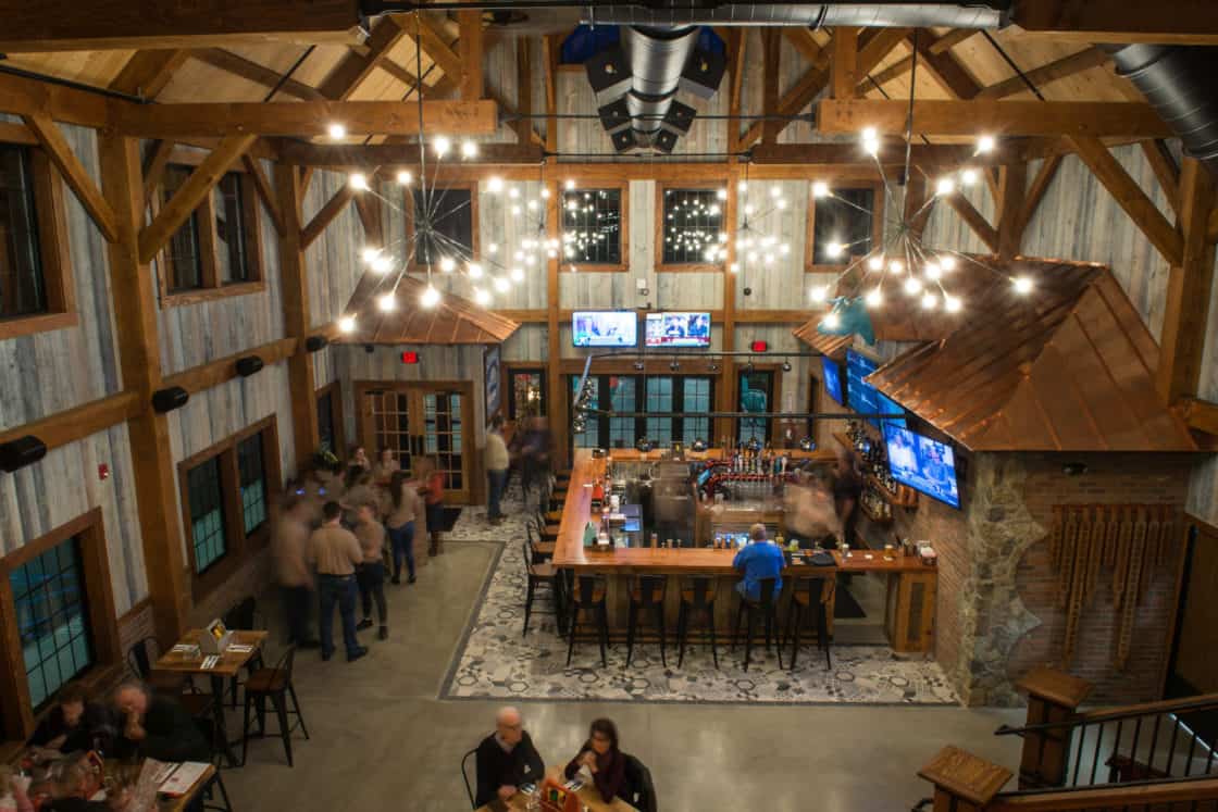 This custom-crafted burger restaurant deserved a custom-crafted home. A blend of traditional timber building with modern touches, the 3,800-square-foot space is filled with bold timber framing to complement the bold beers and flavors on the menu. Hand-forged metal hardware is featured throughout, and a beautiful bar paneled with reclaimed hewn oak dazzles in the center of the room. A grand staircase leads to a second-story loft, letting diners take in the bustling scene below.