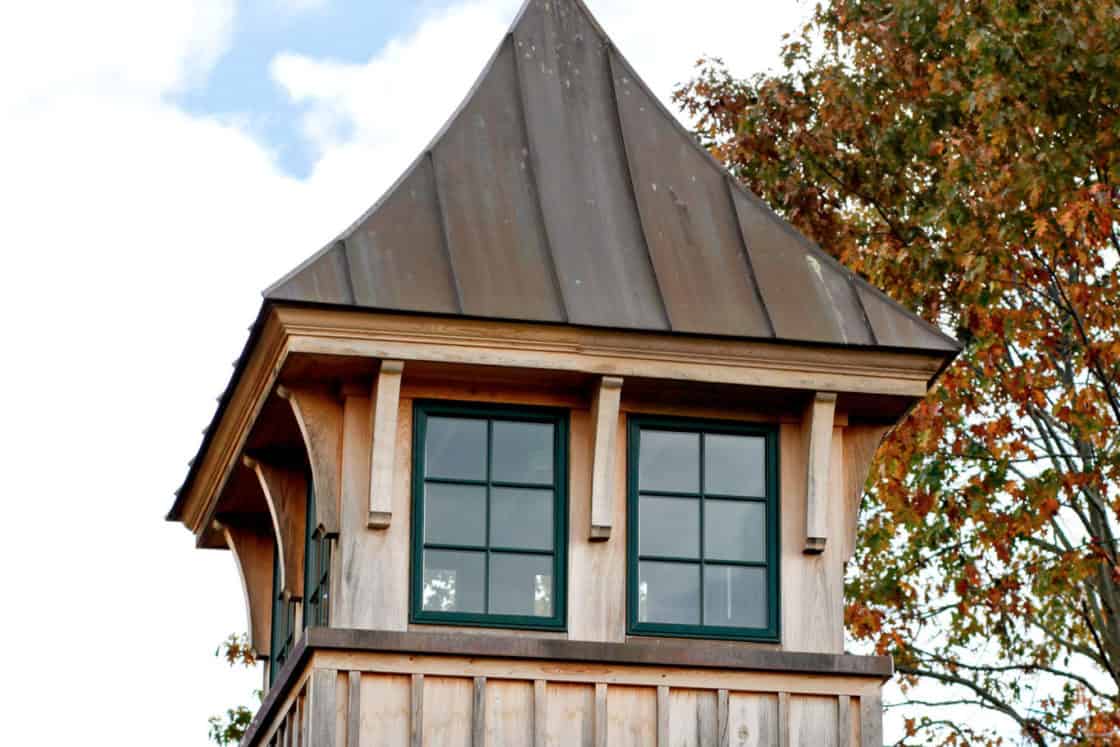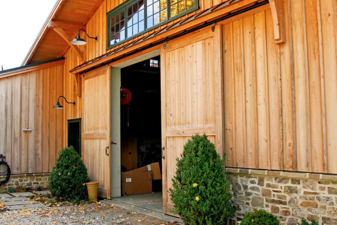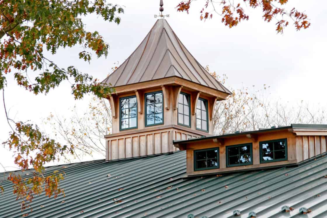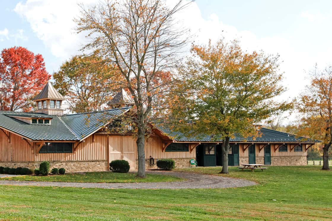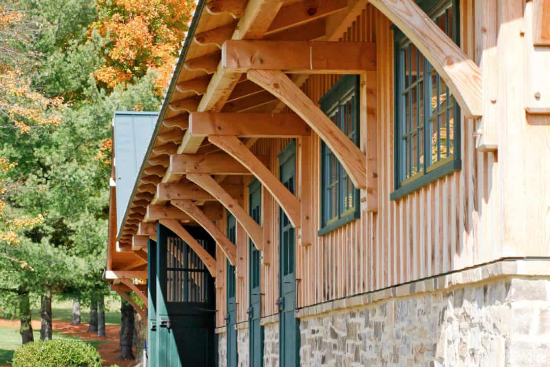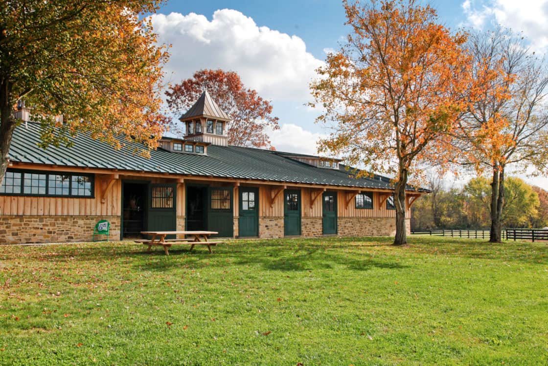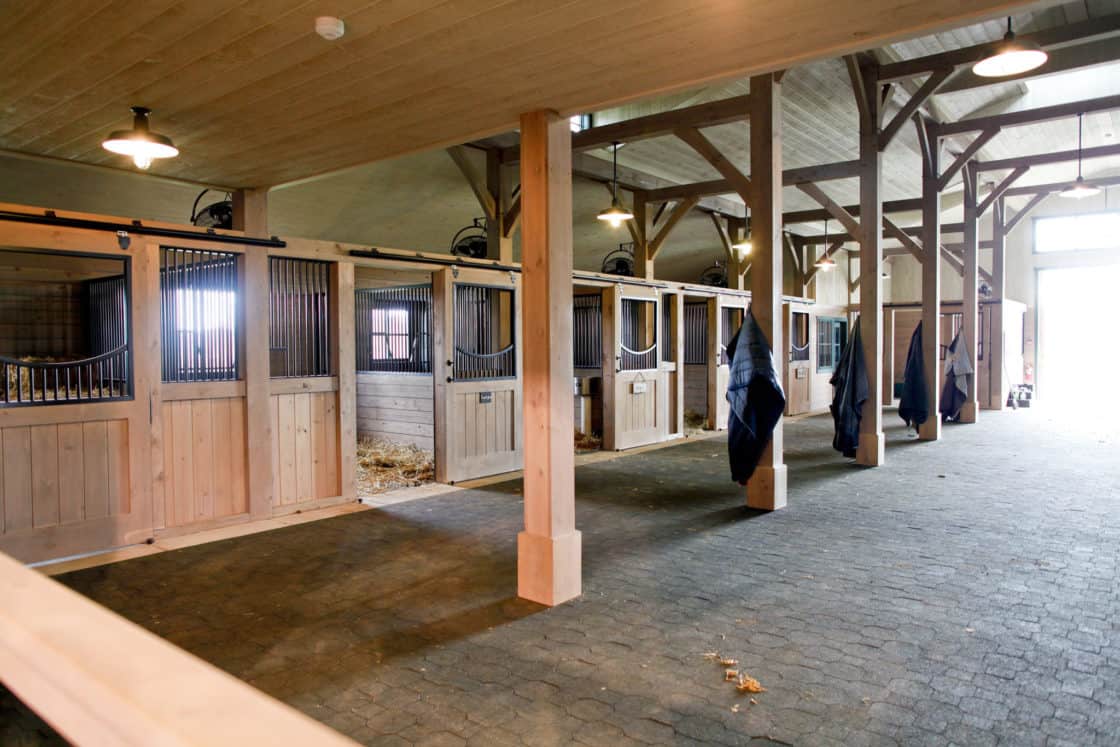 From the shell of a mid-20th-century cement block barn, a refreshed and repurposed barn emerged, befitting of the equestrian facility it serves. Cedar siding and stone wainscoting elevate the aesthetic of the structure, while green window frames, doorways, and gooseneck barn lights accentuate a striking color palette that’s also echoed in the steel seamed roof. Three large cupolas adorn the roofline, letting in light and serving as ventilation to catch barnyard breezes.
