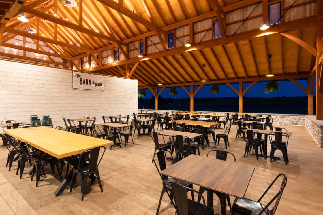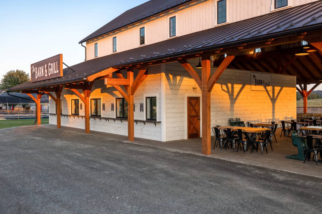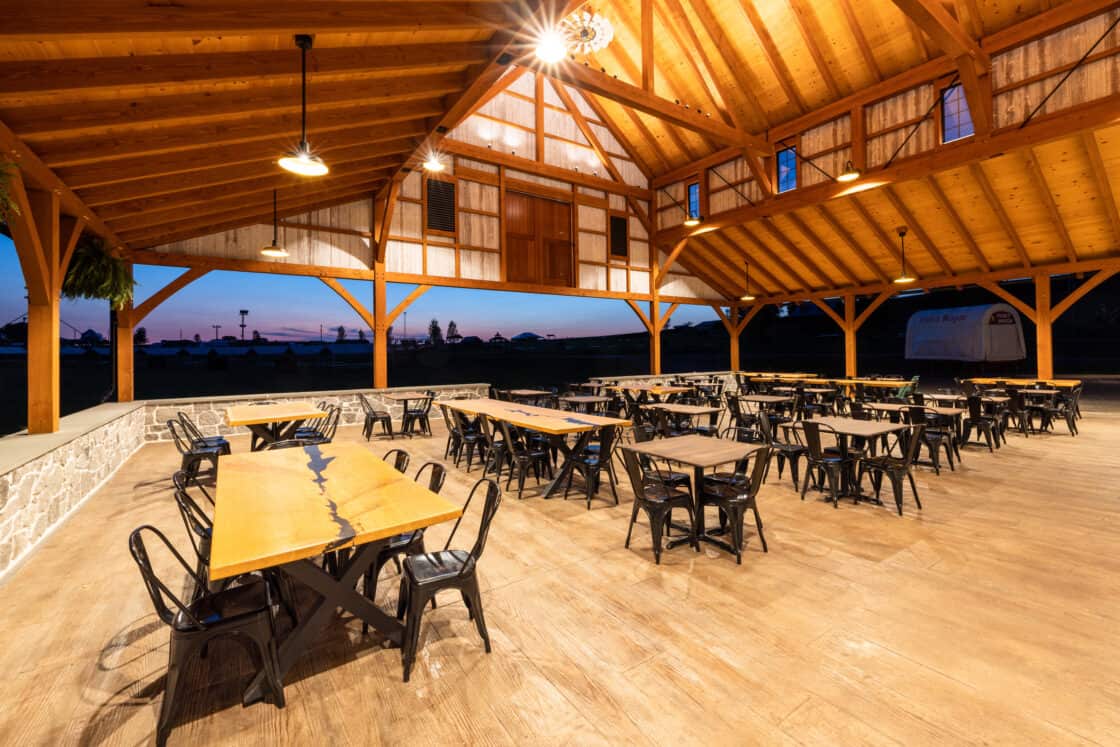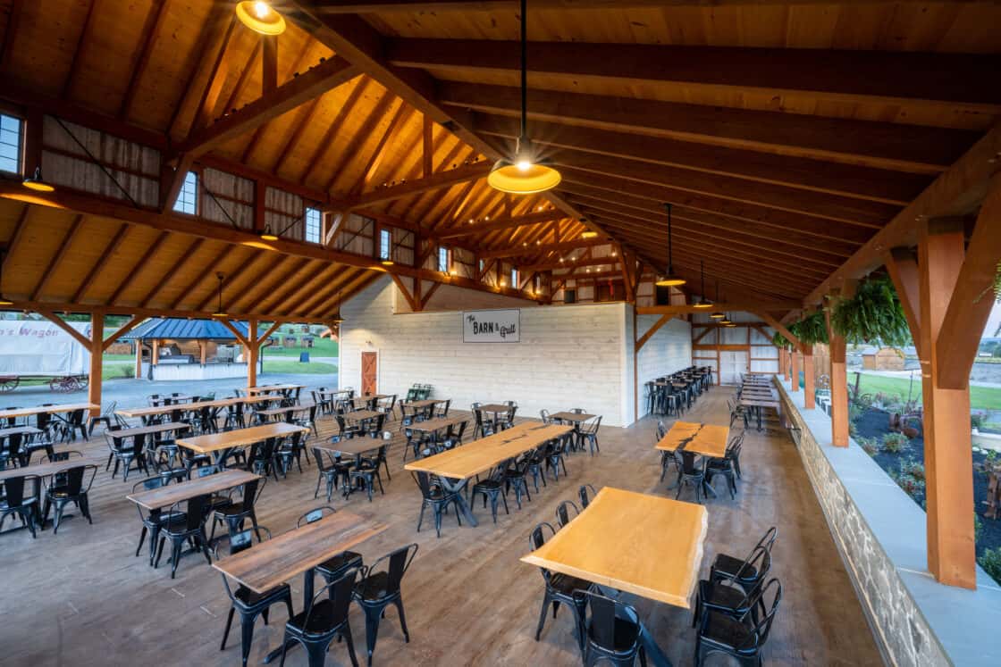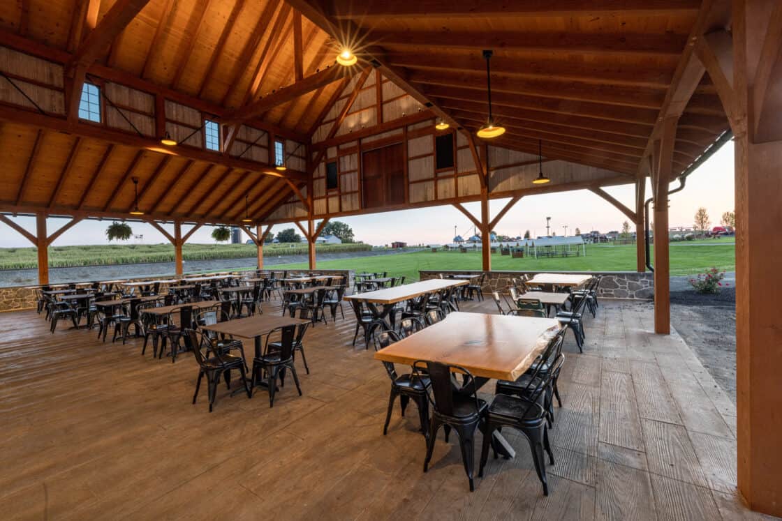 This 4,000-square-foot timber frame pavilion and refreshment stand serves a busy tourist haven overlooking the famous Strasburg Railroad, hosting thousands of hungry visitors every day in the summer. The Douglas fir timber beams support a clerestory roof that allows light to fall onto the dining area below, where natural cut tables, high tops, and café tables blend with the rustic feel of the structure. Breezes easily blow through, and low stone walls allow for views of the Lancaster County countryside beyond.
