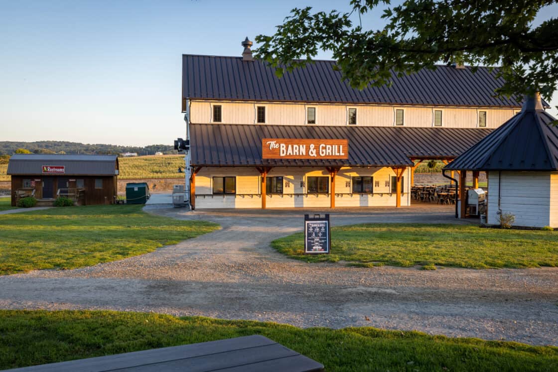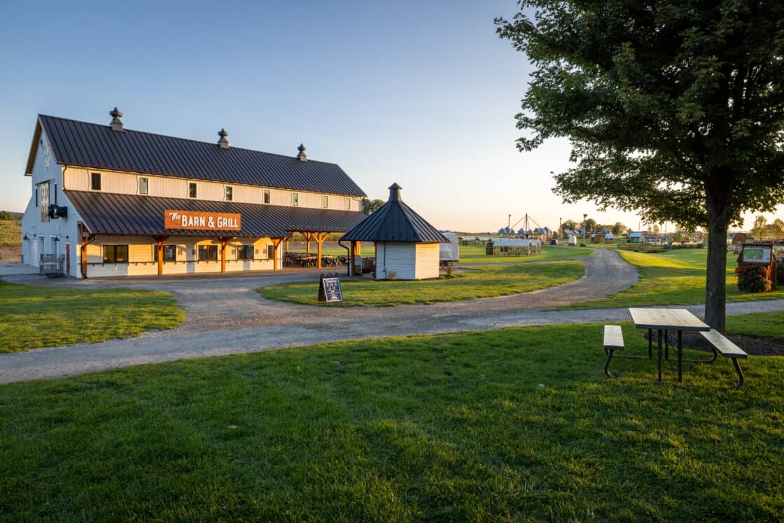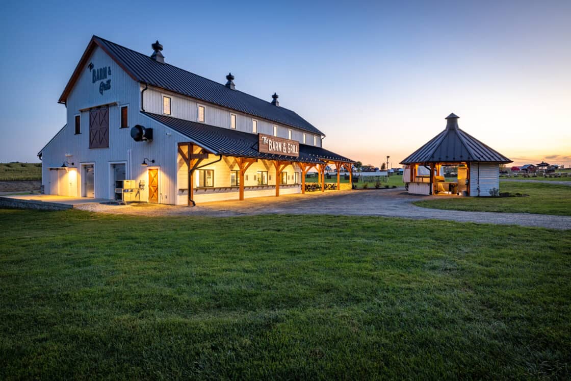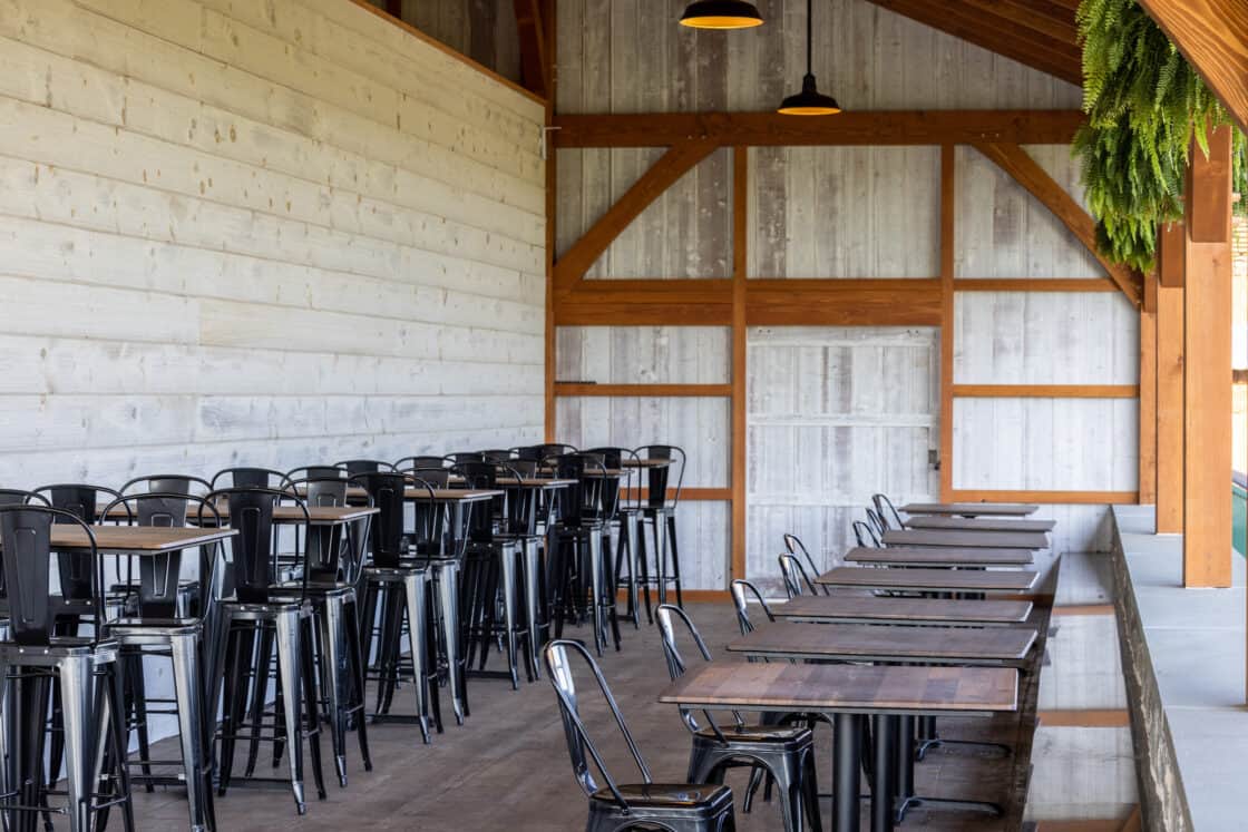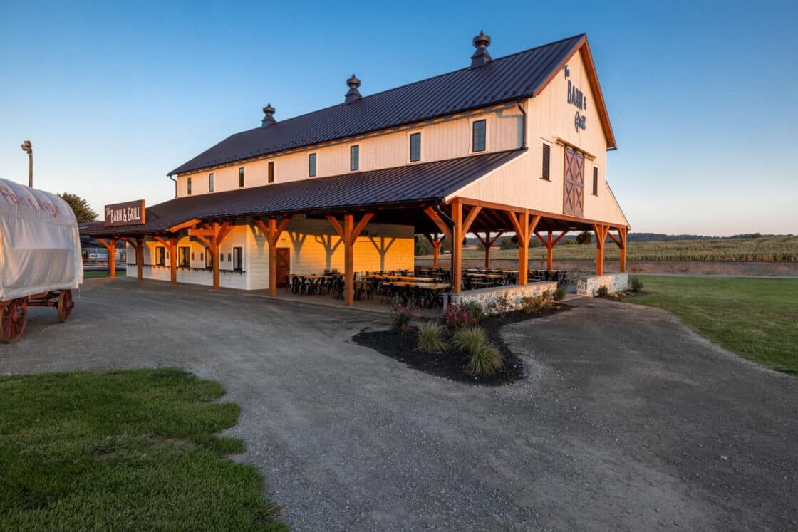 This 4,000-square-foot timber frame pavilion and refreshment stand serves a busy tourist haven overlooking the famous Strasburg Railroad, hosting thousands of hungry visitors every day in the summer. The Douglas fir timber beams support a clerestory roof that allows light to fall onto the dining area below, where natural cut tables, high tops, and café tables blend with the rustic feel of the structure. Breezes easily blow through, and low stone walls allow for views of the Lancaster County countryside beyond.