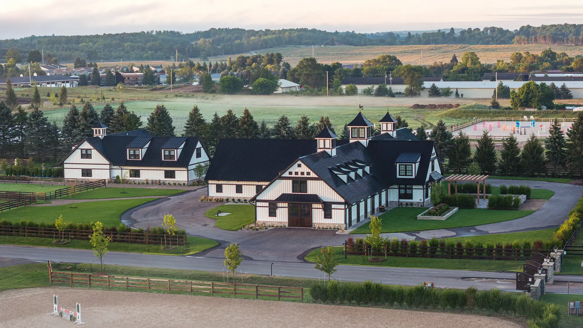 The long wings of this 22-stall equestrian stable are anchored by a central hub that contains a first-floor office and comfortable living quarters above. Dormers and cupolas punctuate the standing seam roof, allowing natural light to gently illuminate the Blackwood iron and oak stalls below. Four wash bays, three grooming bays, and a comfortable tack room are easily accessed through the wide corridors beneath robust mortise-and-tenon joined oak beams. A nearby garage shelters hay, while four paddocks connect to a simple yet elegant run-in.