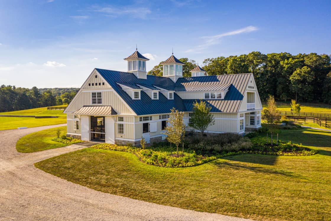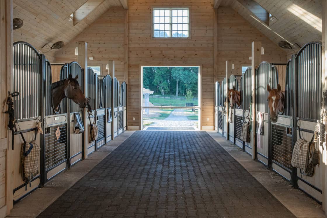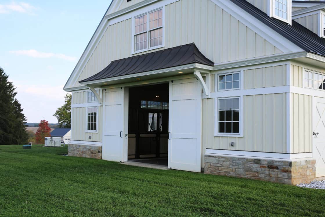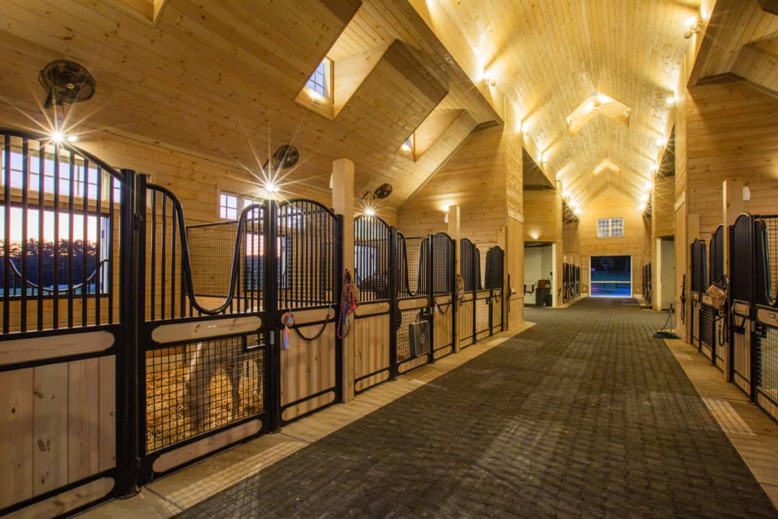 This 12-stall horse barn is 6,100 square feet of pure beauty. Light wood and a large, open interior give the stables a bright and airy feeling, complemented by the off-white Hardie Plank siding and light stone on the exterior. The barn includes four wash/groom stalls, rubber floors, a tack room, laundry room, feed room, storage, an owner’s office, and groom’s quarters. Custom features unique to this project include the horse stalls, mahogany doors, and functional cupolas with fans.