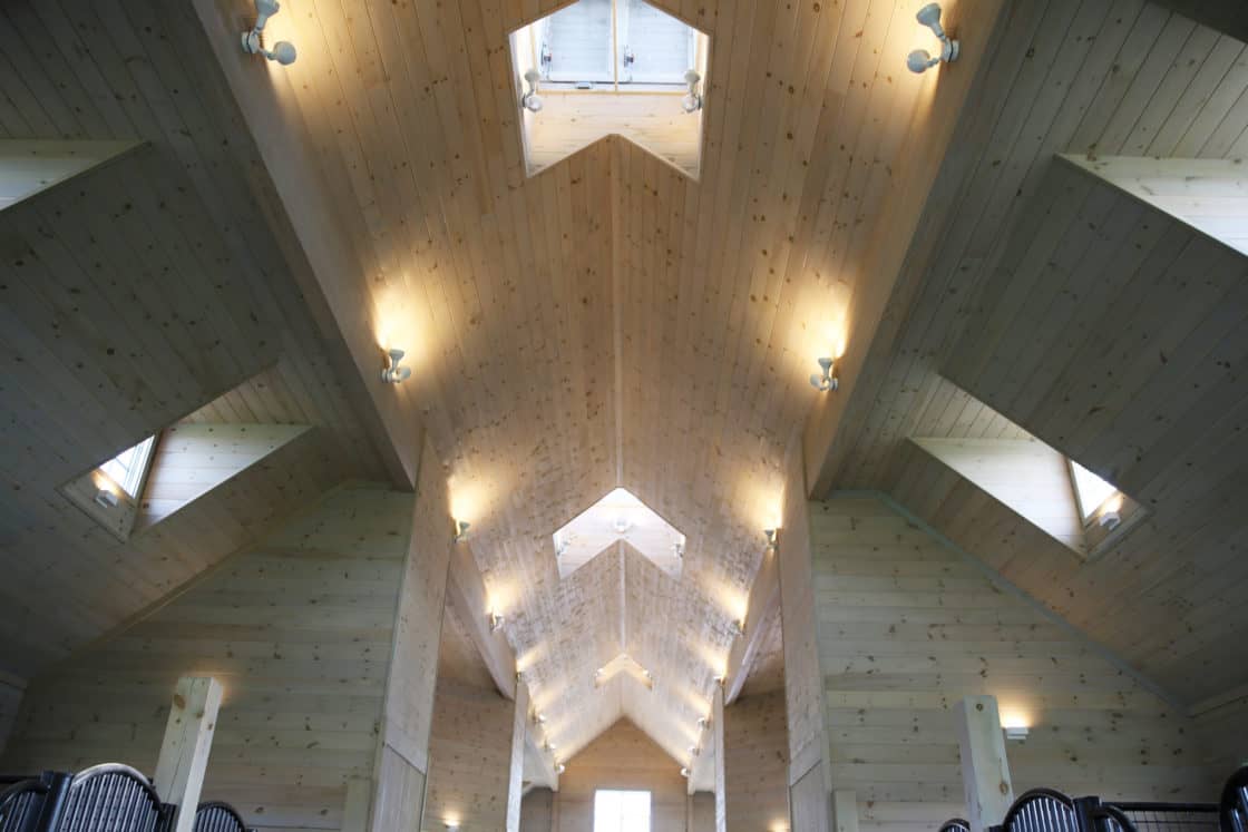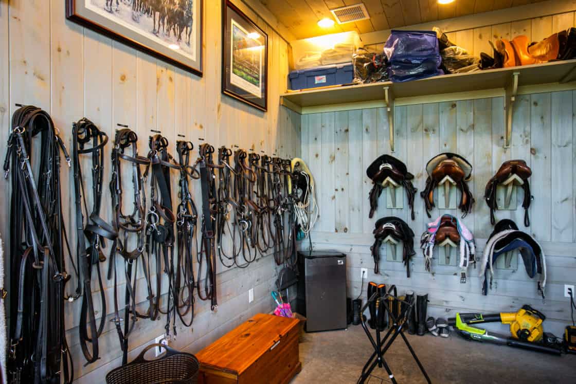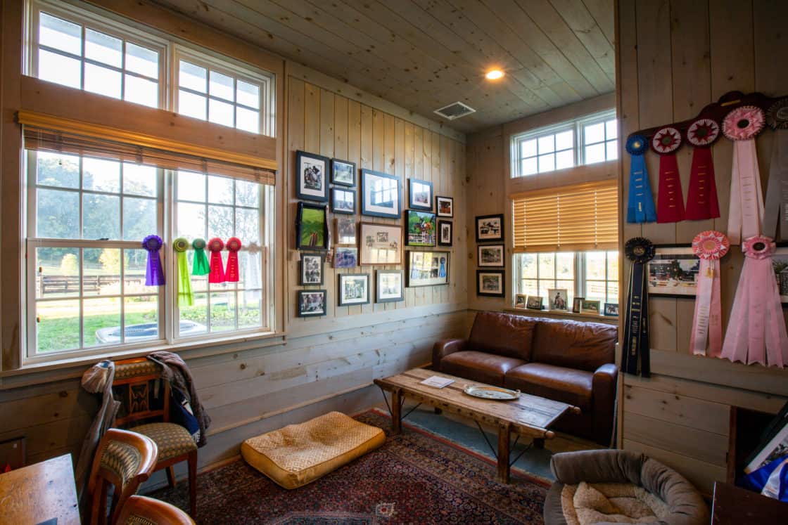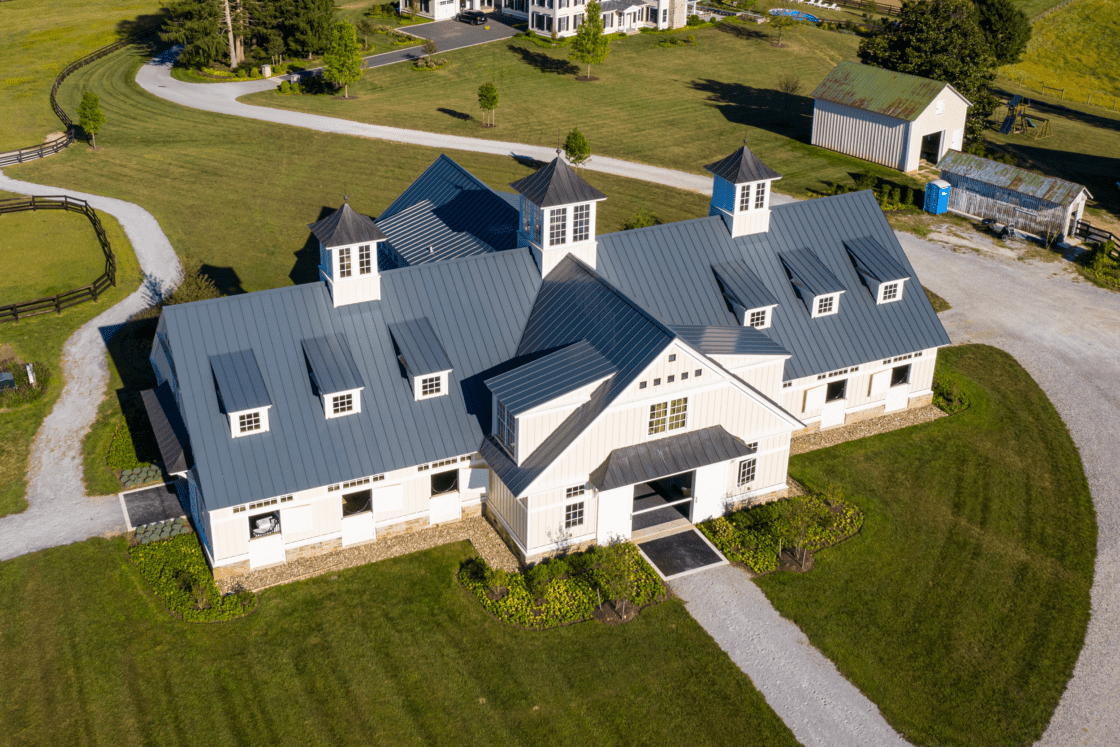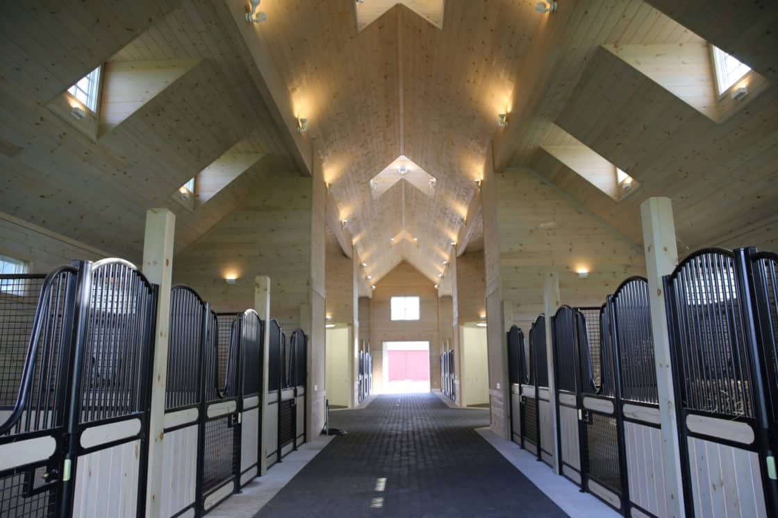 This 12-stall horse barn is 6,100 square feet of pure beauty. Light wood and a large, open interior give the stables a bright and airy feeling, complemented by the off-white Hardie Plank siding and light stone on the exterior. The barn includes four wash/groom stalls, rubber floors, a tack room, laundry room, feed room, storage, an owner’s office, and groom’s quarters. Custom features unique to this project include the horse stalls, mahogany doors, and functional cupolas with fans.